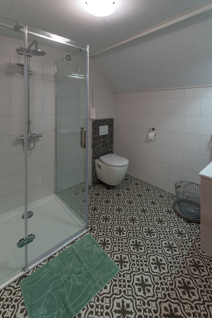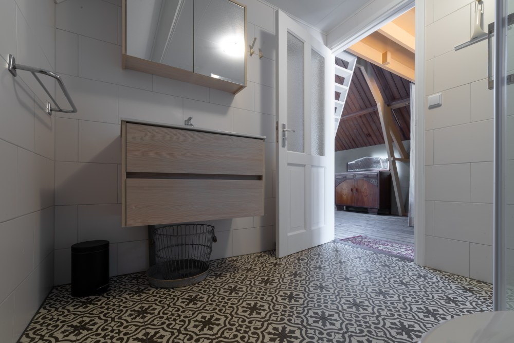 In het slaapgedeelte, afgescheiden met een gordijn, staat een royaal 2-persoons bed en daarboven is een slaapzoldertje met twee 1-persoonsbedden. Via een afsluitbare deur komt men in een moderne badkamer met douchecabine, wasbak en toilet. In het slaapgedeelte vindt men ook een buitendeur die toegang geeft tot het ruime balkon waar het heerlijk vertoeven is en men een prachtig uitzicht heeft over de uitgestrekte Kruispolder. Op de begane grond (in de entrée) bevindt zich een sauna cabine voor 2 personen.